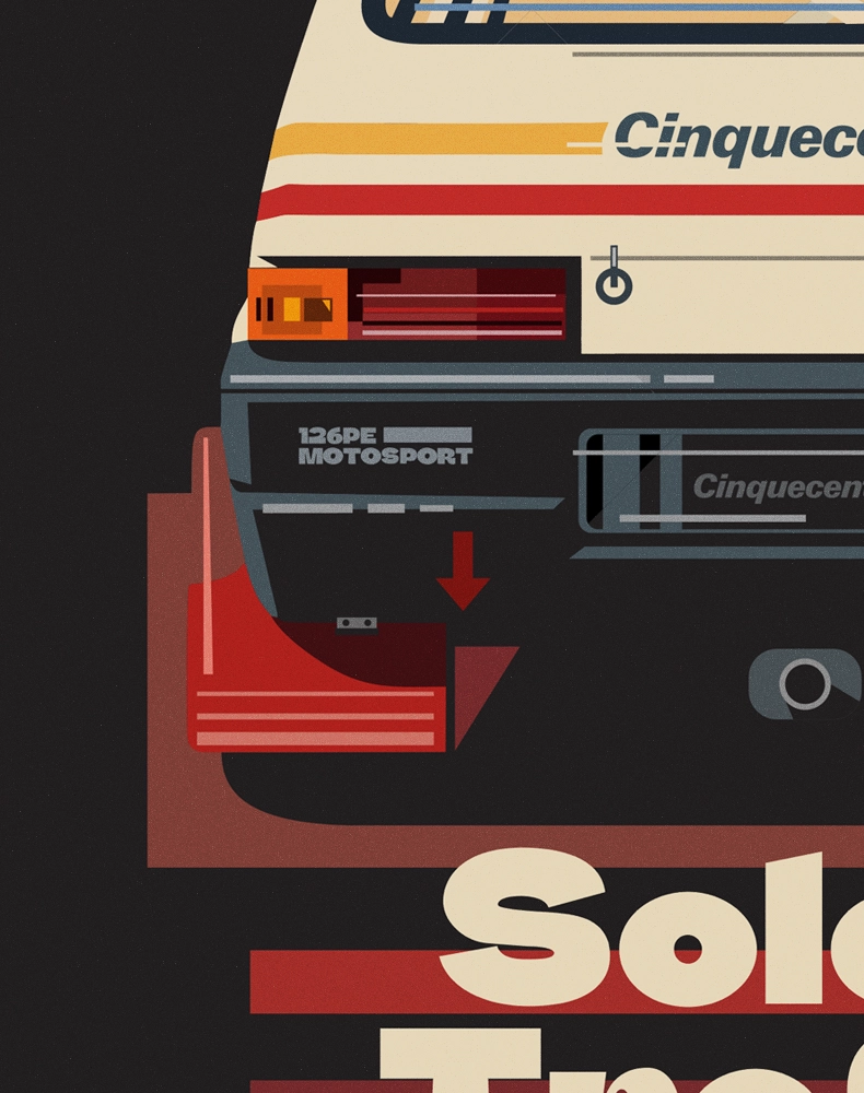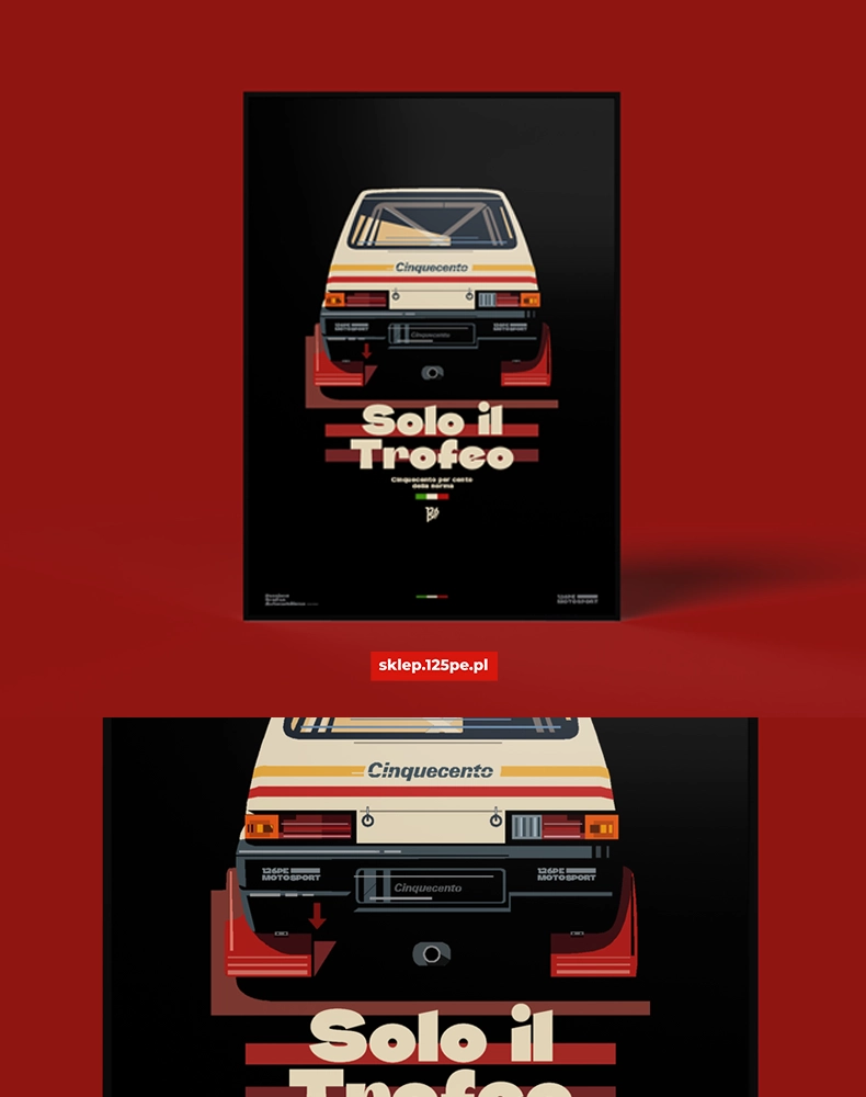 Plakat „Cinquecento Trofeo – Solo il Trofeo.” to autorska ilustracja oddająca esencję włoskiego motorsportu lat 90. Centralnie przedstawiony tył wyścigowego Cinquecento w pełnym rajdowym setupie — klatka, mudflapy, strzałki serwisowe i pasy w barwach Italii — tworzy kompozycję pełną detalu i dynamiki. Mocne hasło „Solo il Trofeo.” nadaje projektowi bezkompromisowy charakter, a napis „Cinquecento per cento della norma” z włoską flagą stanowi subtelny ukłon w stronę fanów włoskiej techniki i wyścigowego DNA. To plakat, który idealnie odnajdzie się w garażu, biurze, pracowni lub pokoju każdego pasjonata; więcej niż dekoracja — manifest dla tych, którzy zawsze jadą ponad normę.
